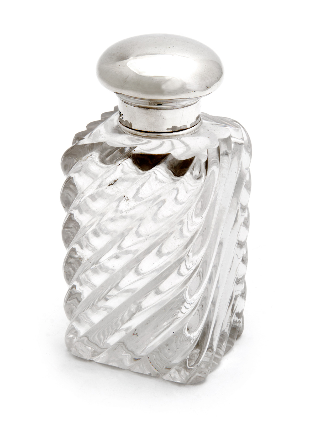 Victorian Rectangular Silver Topped Perfume Bottle with Swirl Design Clear Glass Body