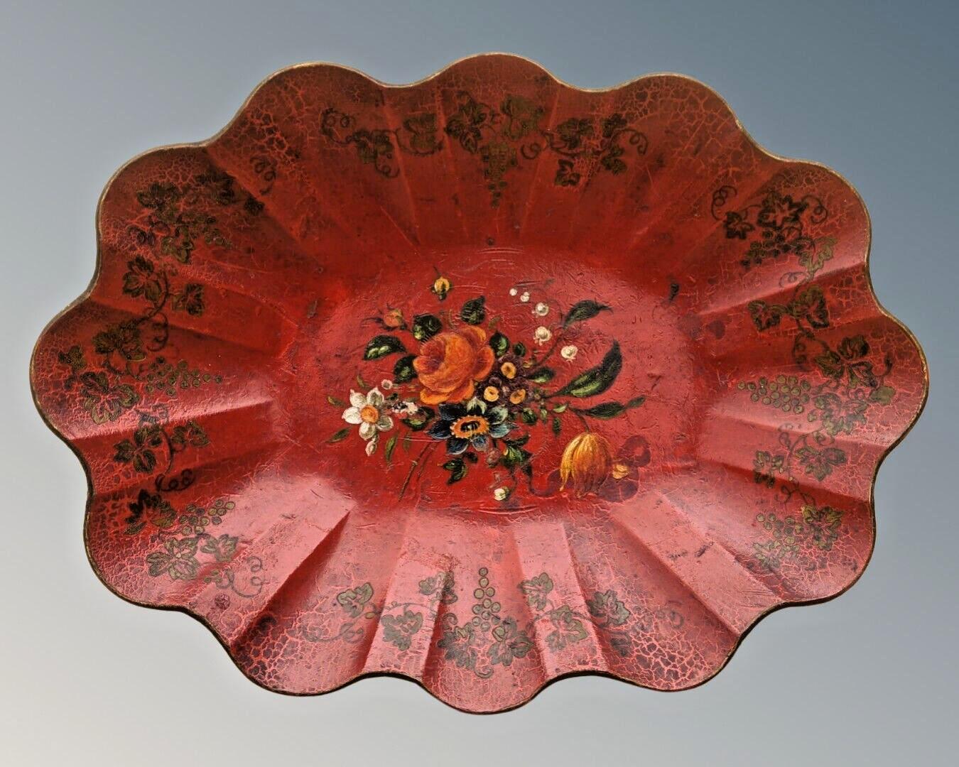 Victorian Red Lacquer Dish Hand Painted Papier Mache