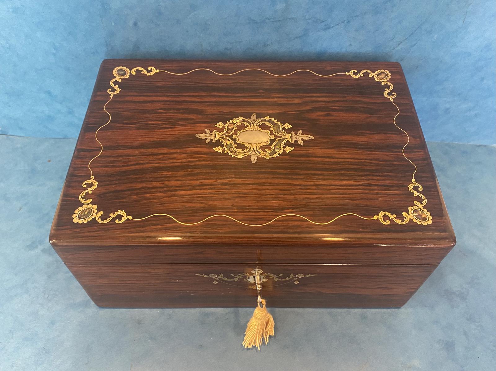Victorian Rosewood Jewellery Box with Brass & Mother of Pearl Inlay