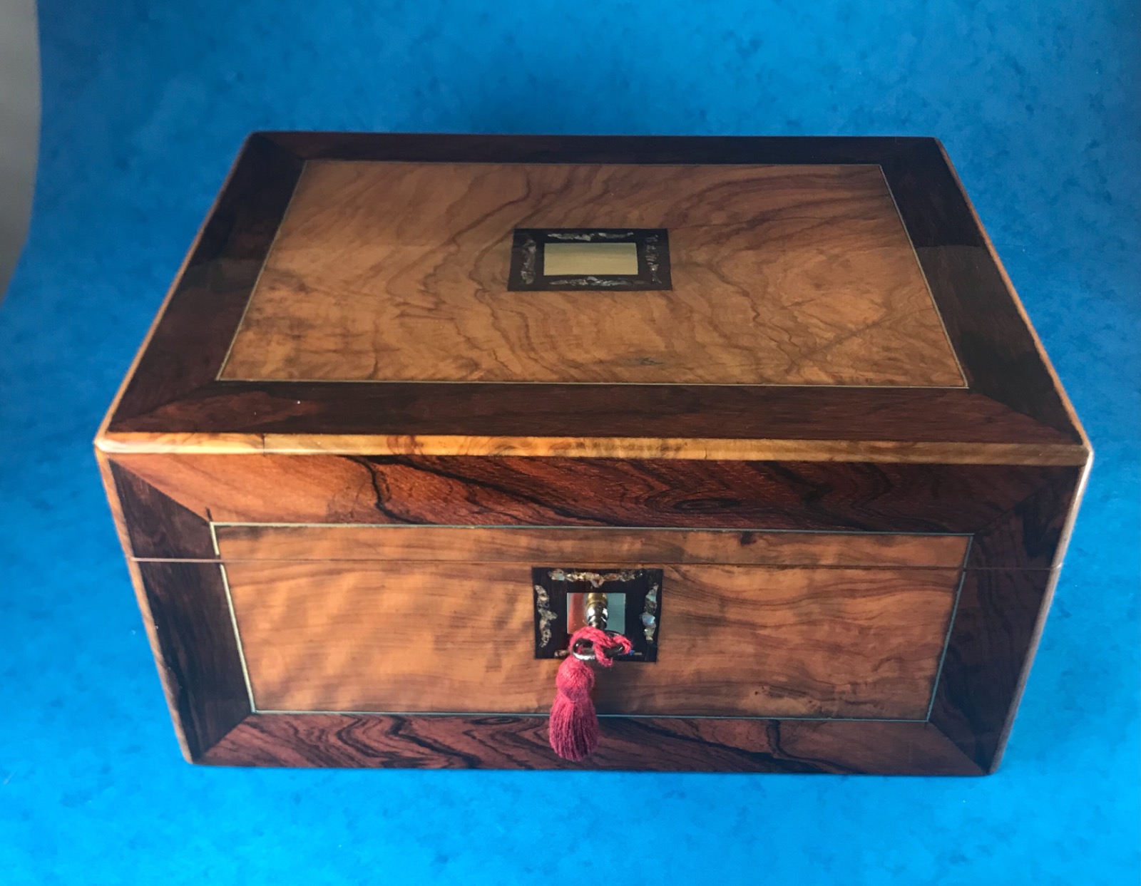 Victorian Rosewood, Olive Wood & Brass Inlaid Jewellery Box