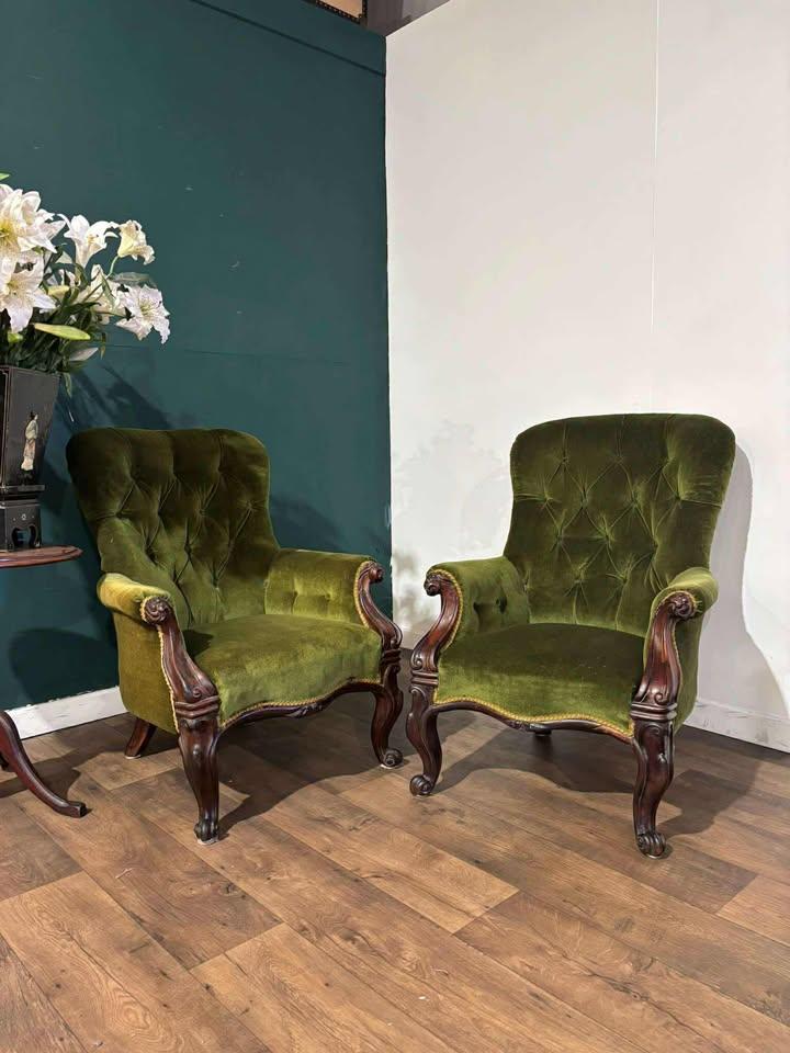 Victorian Rosewood Pair of Button Backed Armchairs – Green Velvet Upholstery