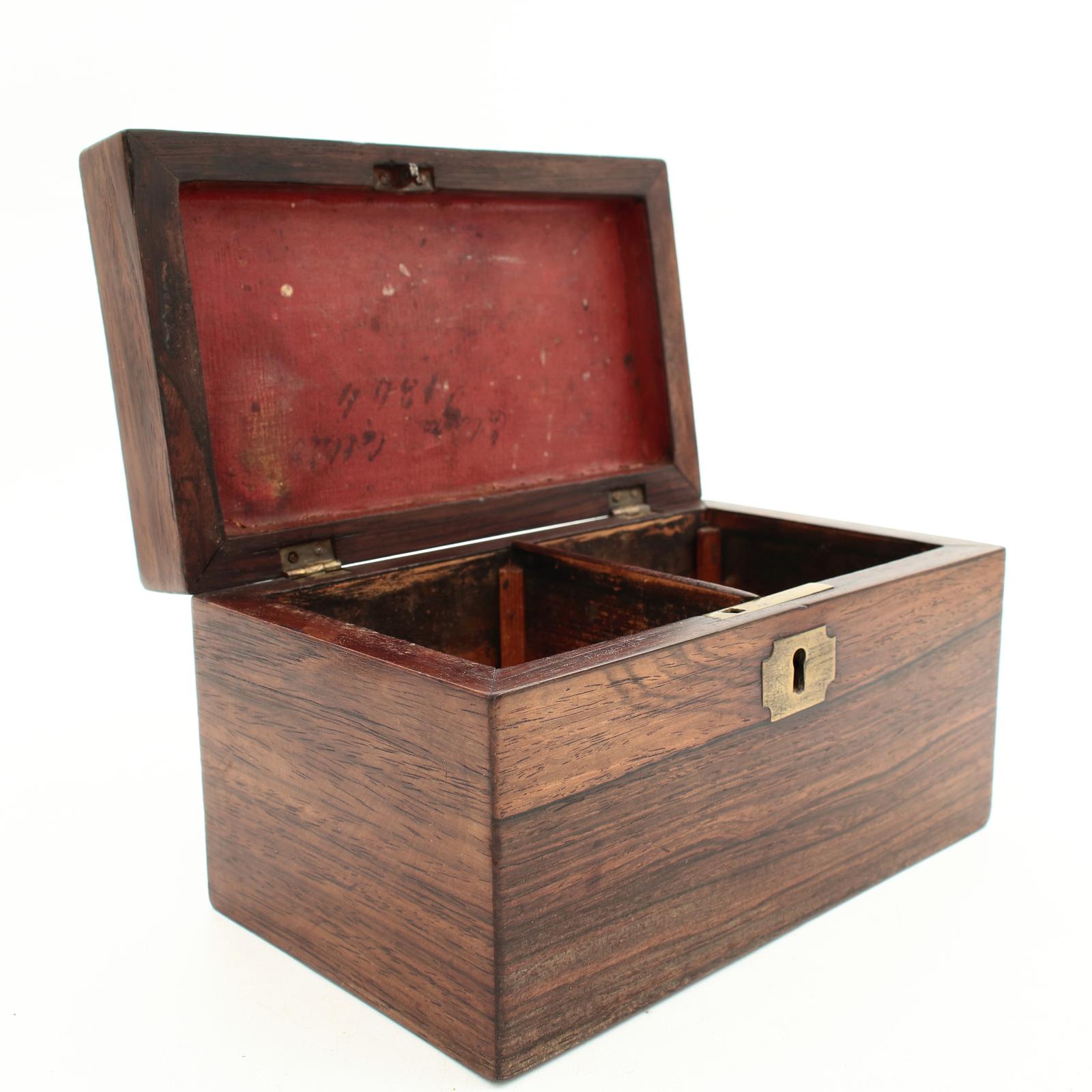 Charming early Victorian tea caddy clad in gorgeous rosewood veneer, two internal tea boxes, inside the lid inscribed ineligible name and date that appears to be 1844.