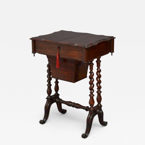 Unusual 19th Century (circa 1870) Victorian antique sewing table in rosewood, having serpentine top fitted with original working lock and a key which open to reveal satinwood compartments with rosewood lids above storage basket, standing on four twisted supports terminating in cabriole legs united by tuned stretchers. This antique work table has been sympathetically restored and is ready to place at home. c1870