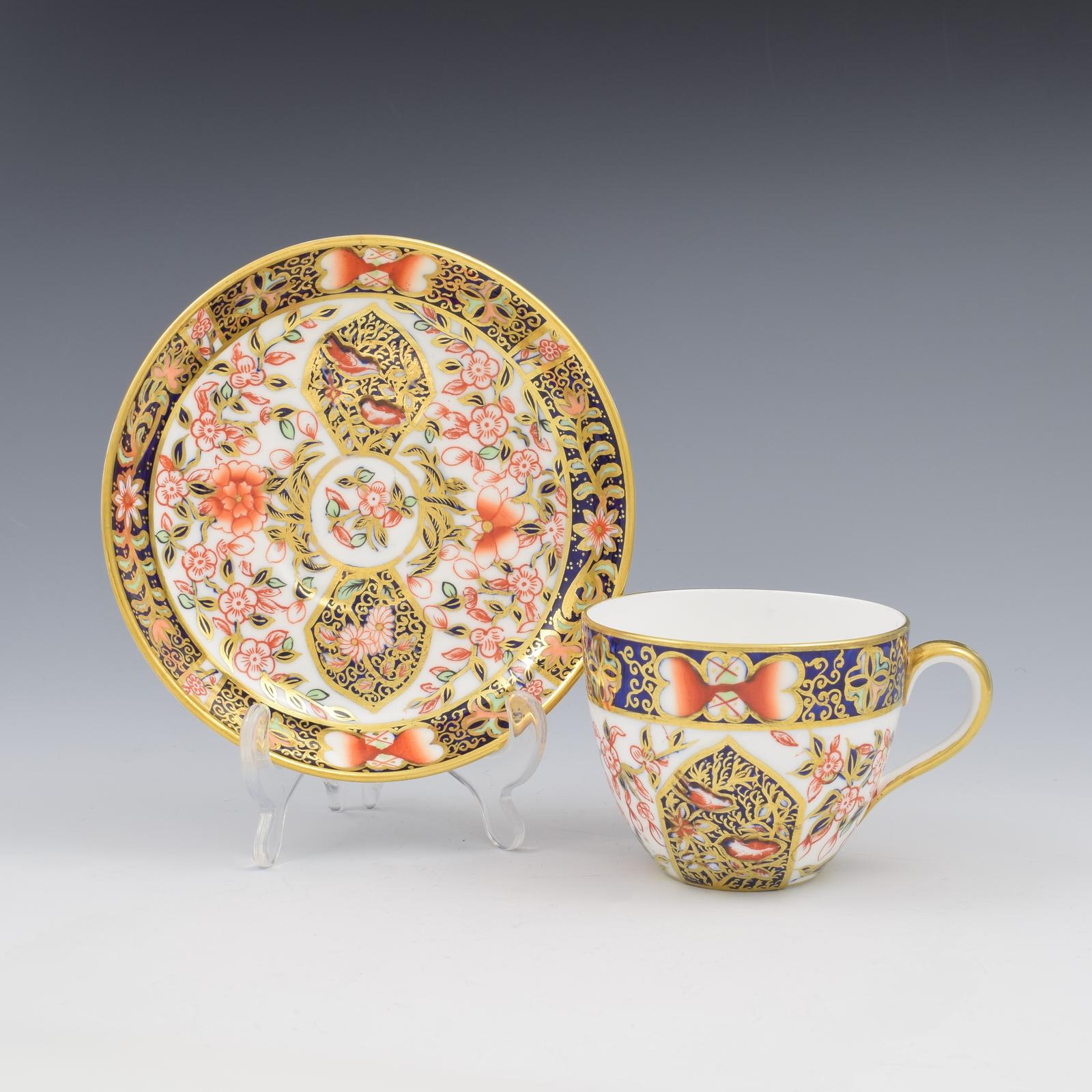 A stunning Victorian Royal Crown Derby cup and saucer in a vibrant imari palette with copious rich gilding. The main central pattern is almost identical to that of well known pattern 198, with two birds in a tree against an underglaze blue ground set in an arched frame. The mirroring frame has a flowering plant amongst gilt scrolls, a red-edged, white reserved, daisy type flower with gilt centres, rather than the solid red stylised flowers of 198. The surrounding background is filled with red-edged, white blossom on gilt branches, with peony and lotus flowers of differing form to those of 198. The wide frieze running around the rims of both pieces is again very similar to 198 in the arrangement of panels and main shapes, but the decoration to the bone shape device is very different, as is the colouring of some of the flowers, and the whole blue ground is ornately filled with gilt scrolls and dots rather than being left plain.