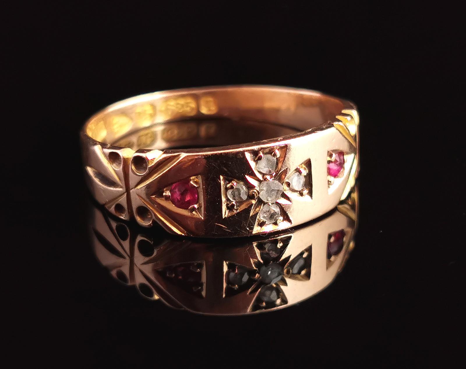 Victorian Ruby and Diamond Ring, Maltese Cross, 15ct Yellow Gold