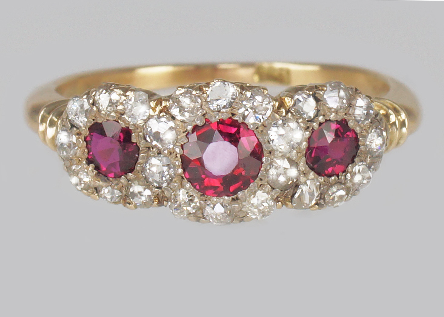 Victorian Ruby & Diamond Triple Cluster Antique 18ct Gold Ring c.1850