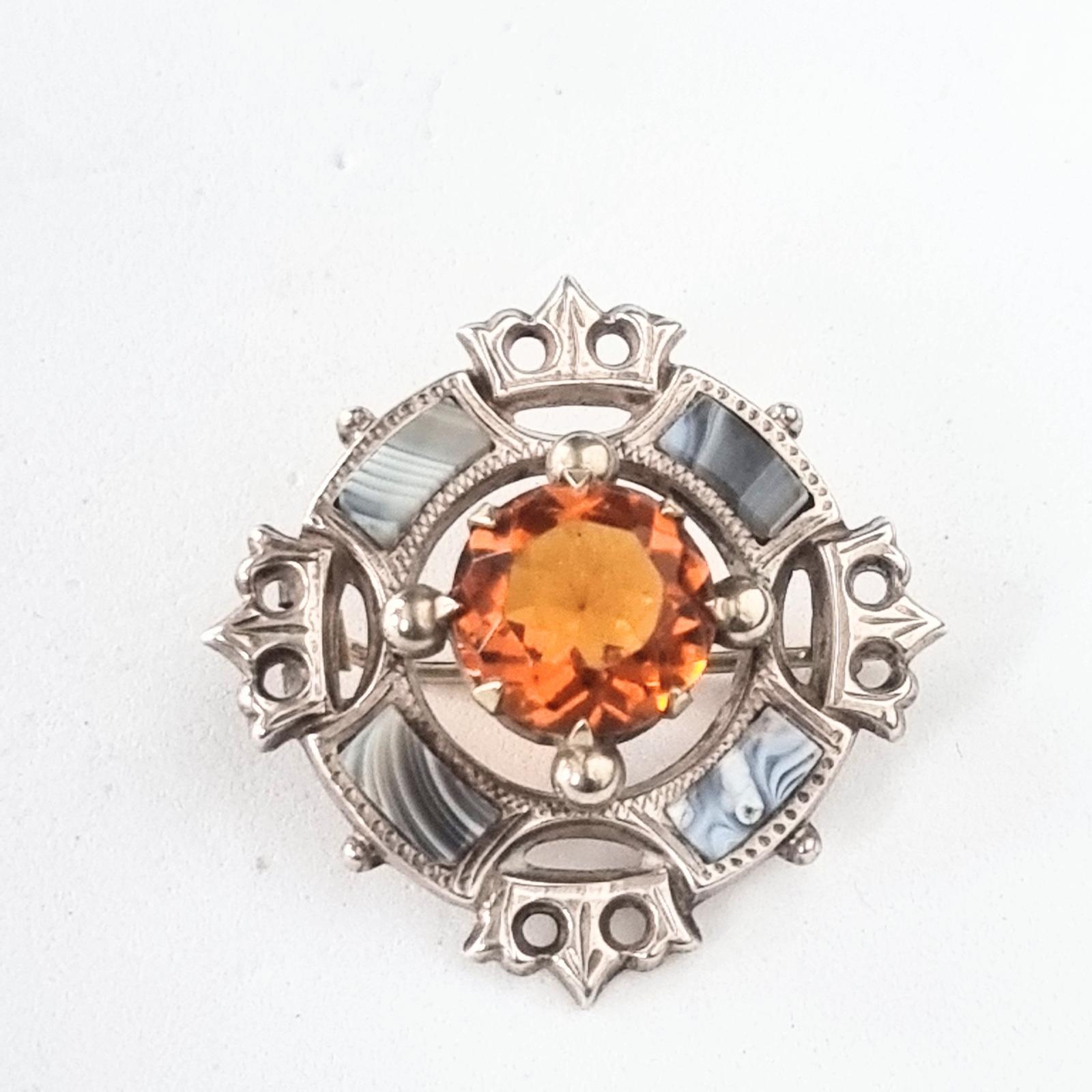 Victorian Scottish Lapel Size Brooch, Agate & Orange Stone