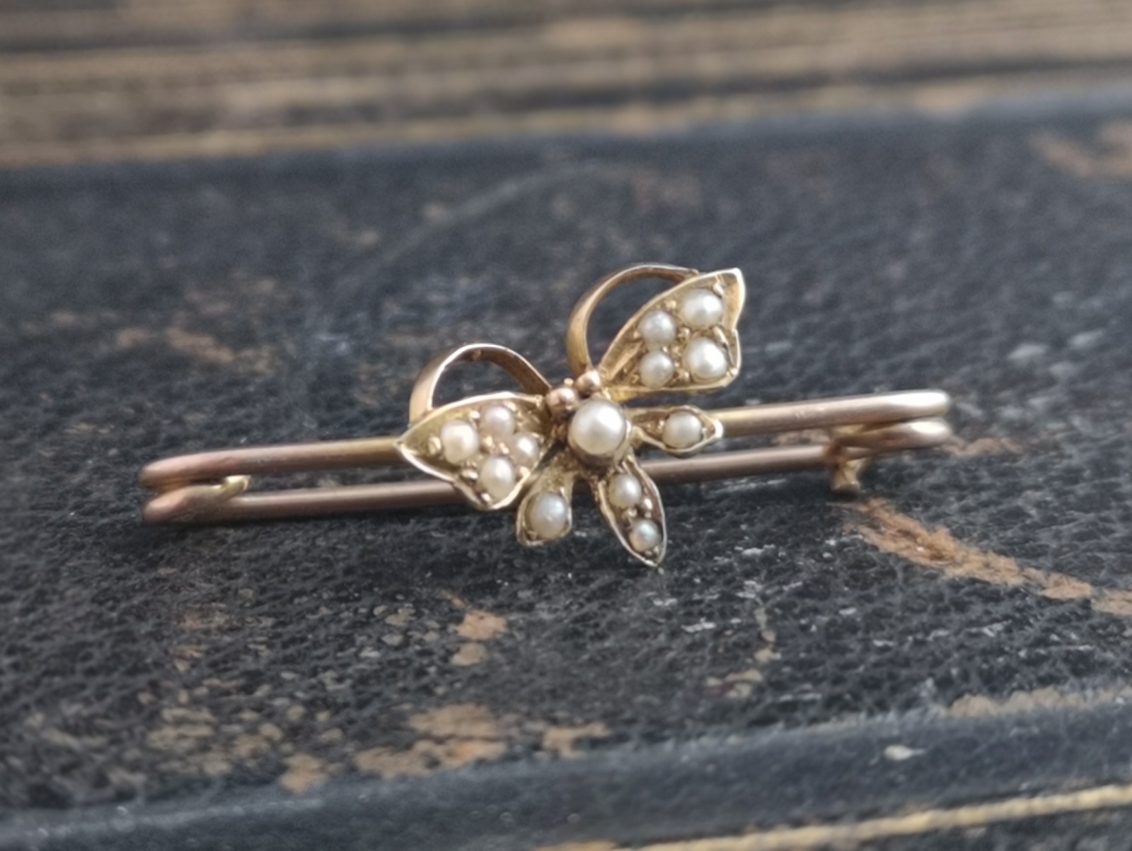 Victorian Seed Pearl Butterfly Pin, Antique 15ct Gold Insect Brooch