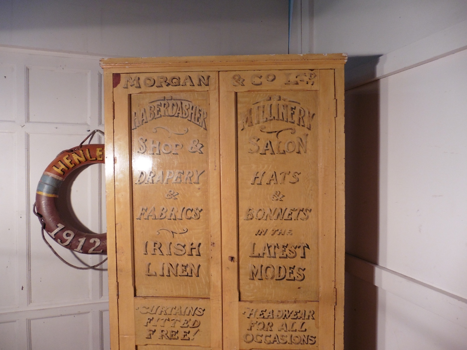 Victorian Sign Painted Pine Cupboard, Haberdashery Shop Display