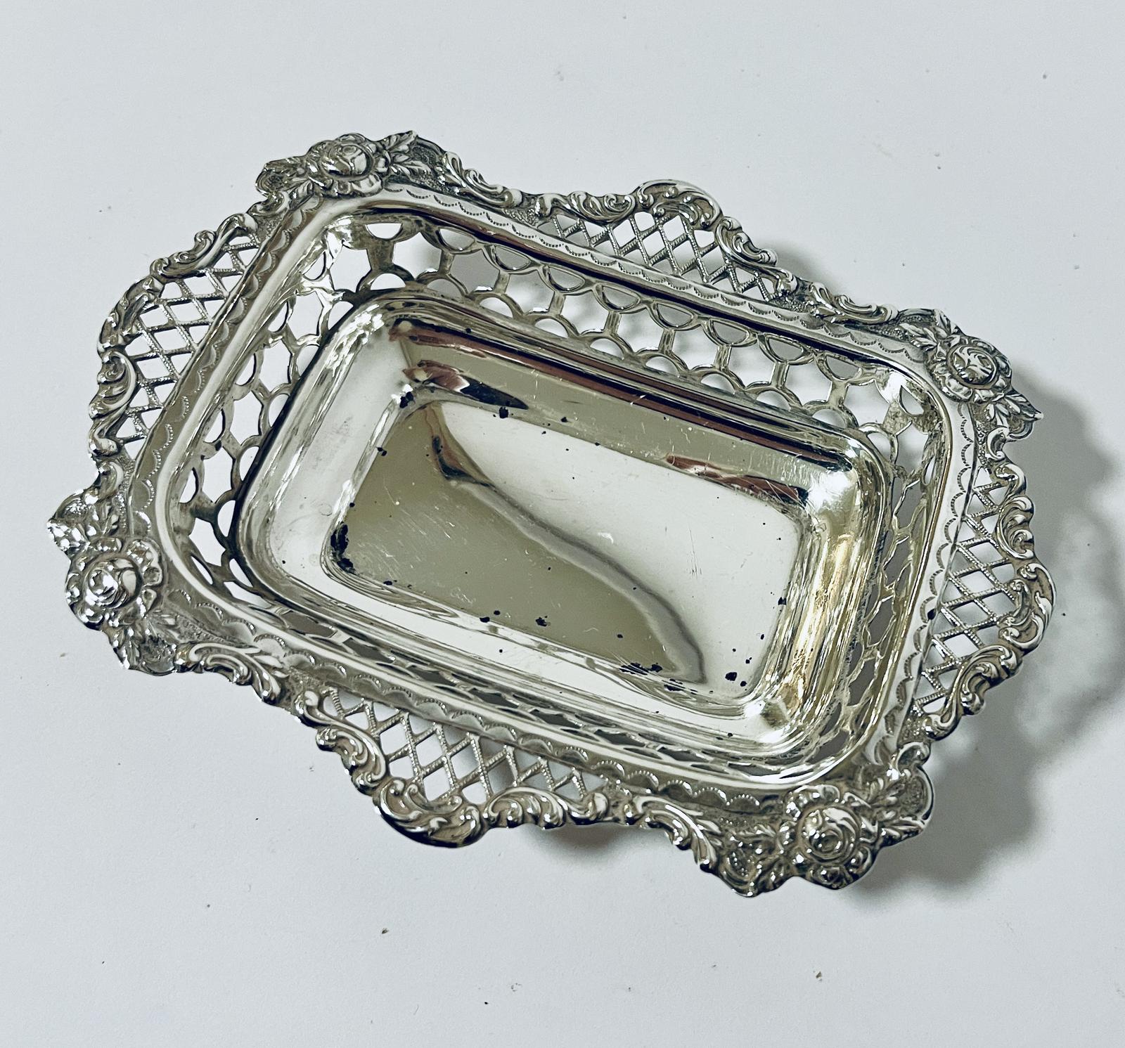A nice example of an ornate pierced bonbon dish of rectangular form. It is stylish and good quality, weighing approximately 70g.