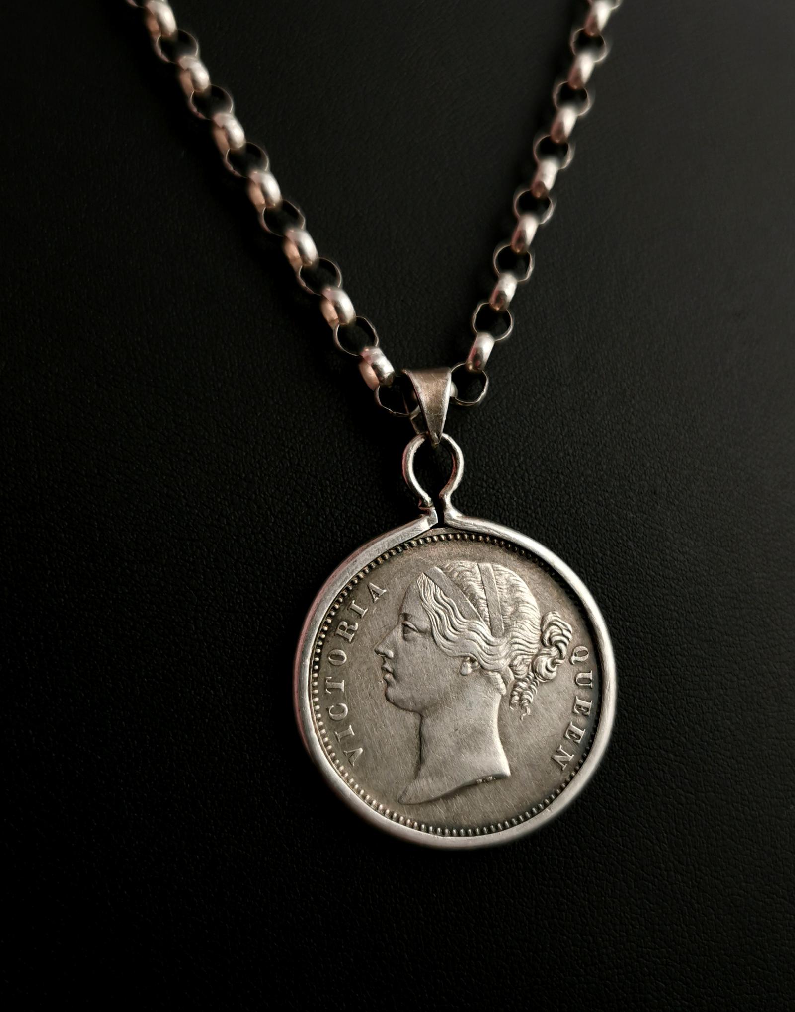 Victorian Silver Coin Pendant, Necklace, 1840 Indian Rupee