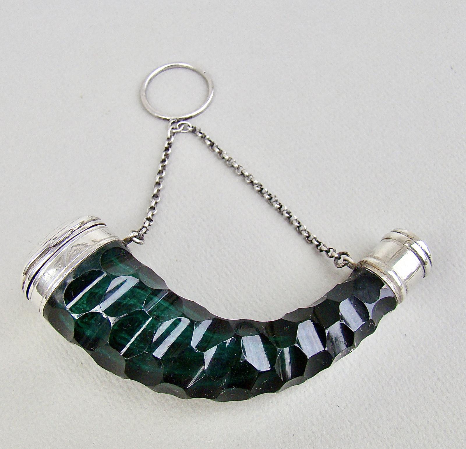 Victorian silver cornucopia Bristol green cut glass scent bottle, circa 1870