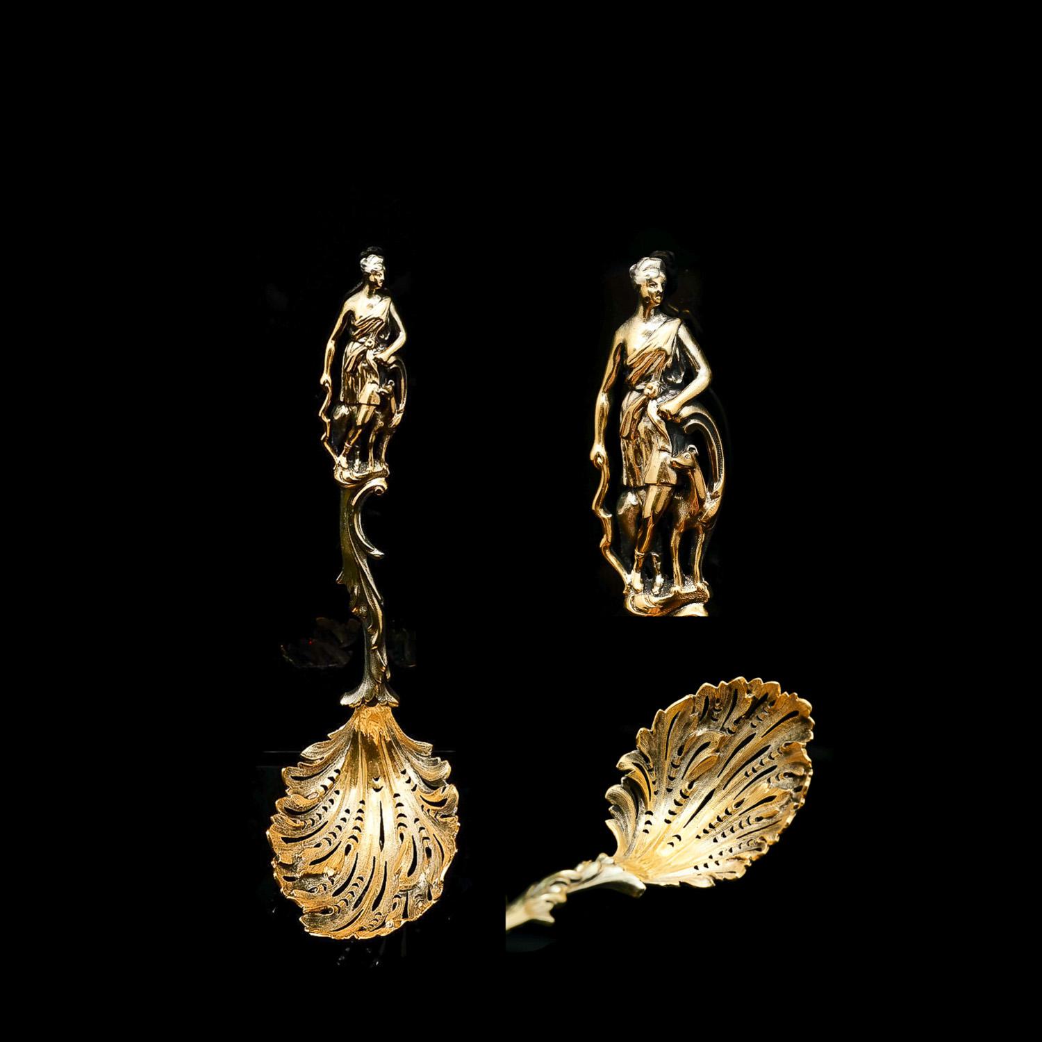 REF: Victorian Silver Gilt Sugar Sifter Spoon 'diana The Huntress' Figure - Francis Higgins 1854 / LA328640