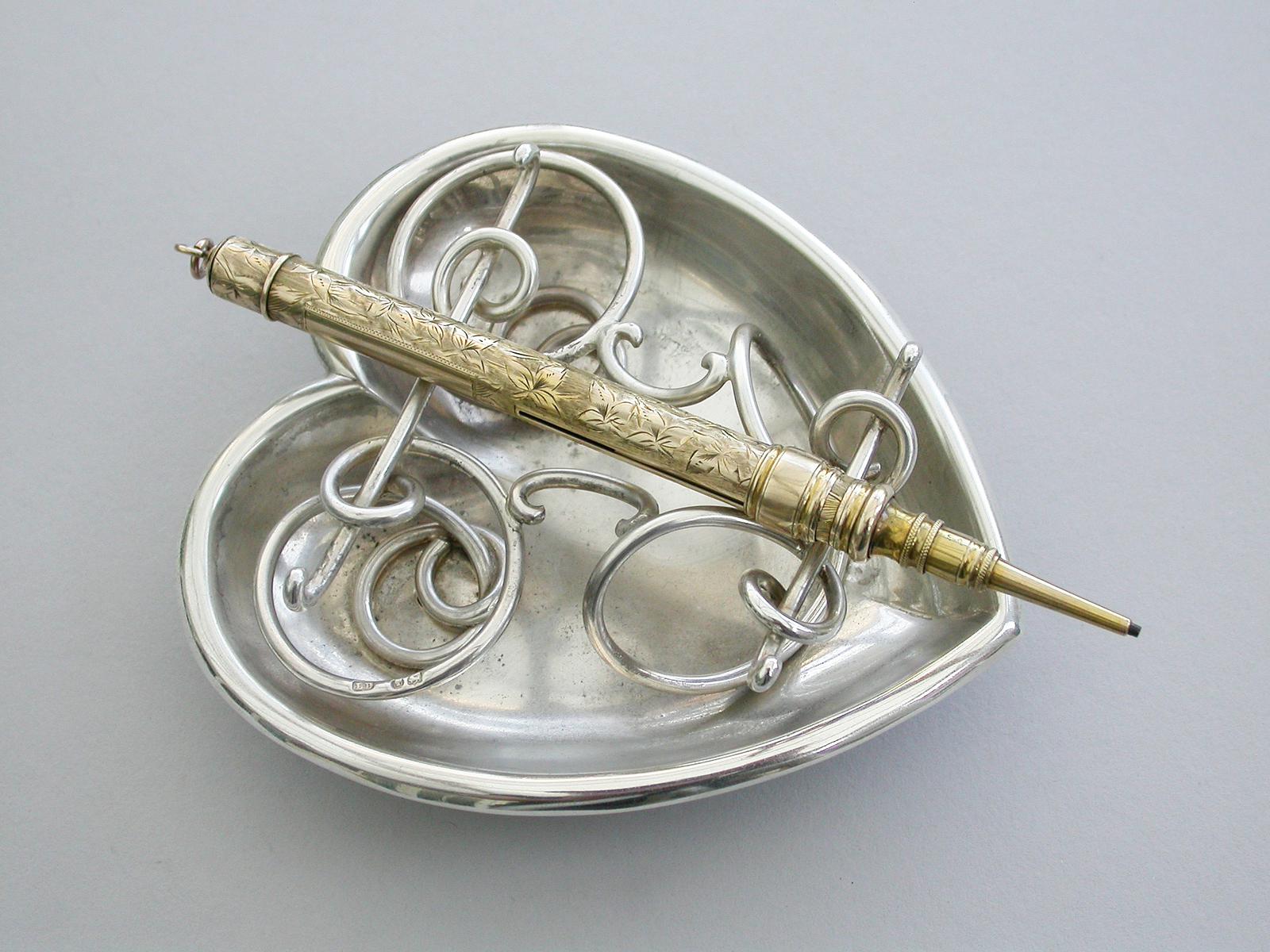 Victorian Silver Heart Shaped Pen Rest / Trinket Dish by Louis Dee, London 1883