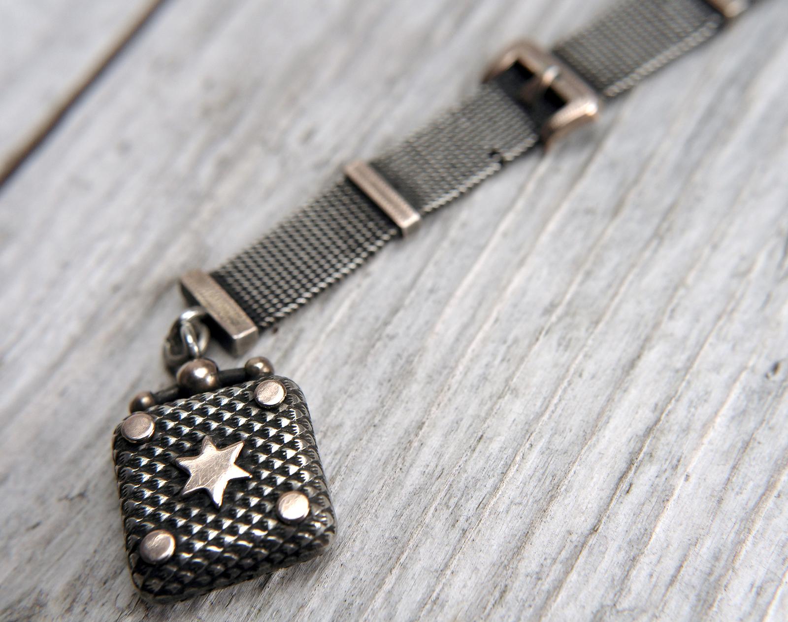 Victorian Silver Mesh Fob Chain with Rose Gilt Details & Star Fob, Antique c.1890