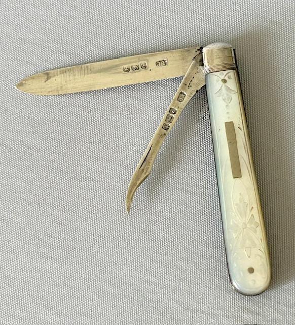A most unusual variation on a Victorian folding silver fruit knife. The handle is crafted in mother-of-pearl, with engraved patterns and a vacant rectangular cartouche. The handle contains two folding blades in hallmarked silver, one is a fruit knife blade and the other a pip remover. A charming and rather rare variation on a popular collector's item.
