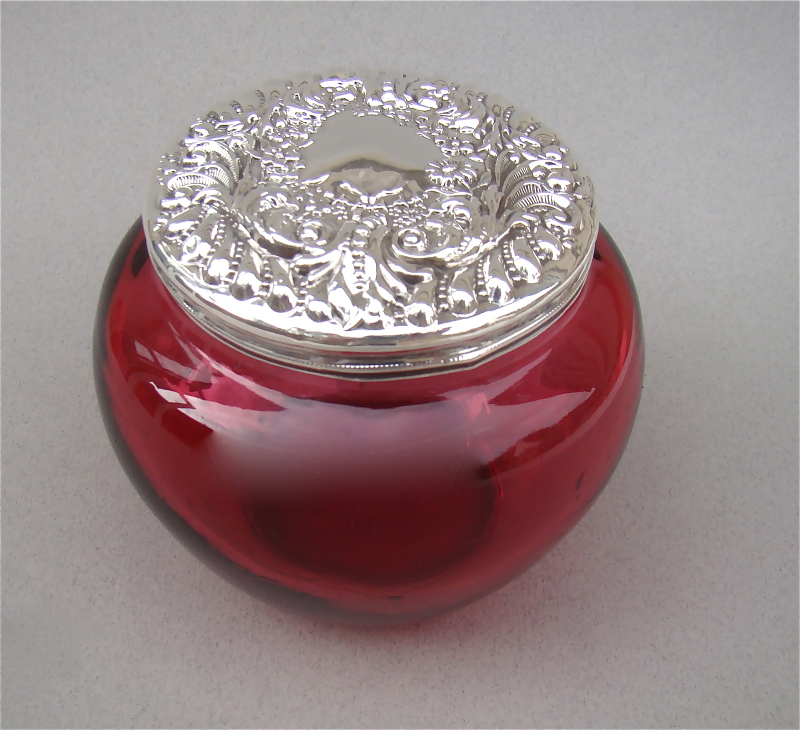 Victorian Silver Mounted Cranberry Glass Dressing Table Jar, Birmingham 1900