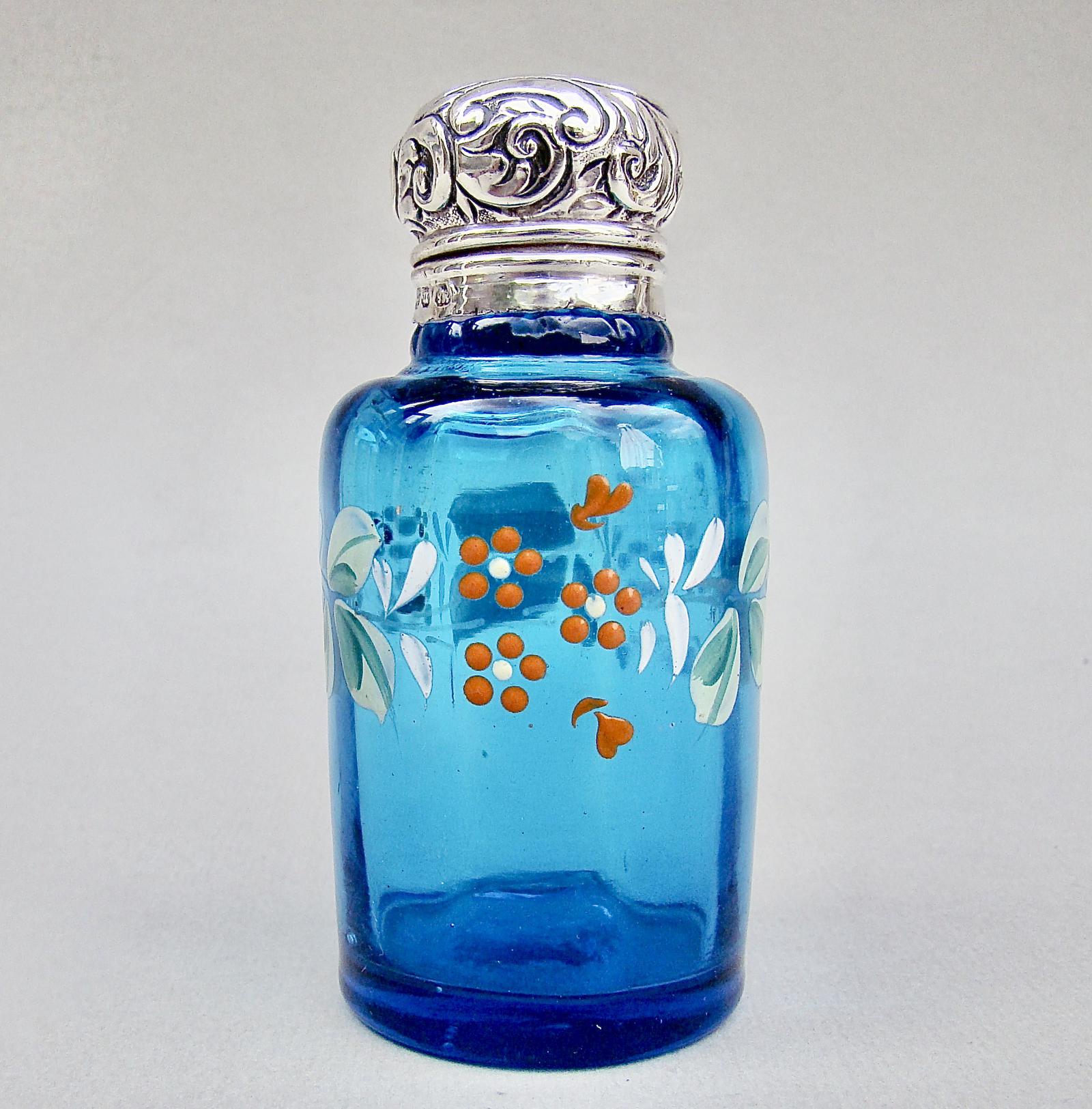 Victorian Silver Mounted Turquoise Enamelled Glass Scent Bottle by Levi & Salaman, Birmingham 1895