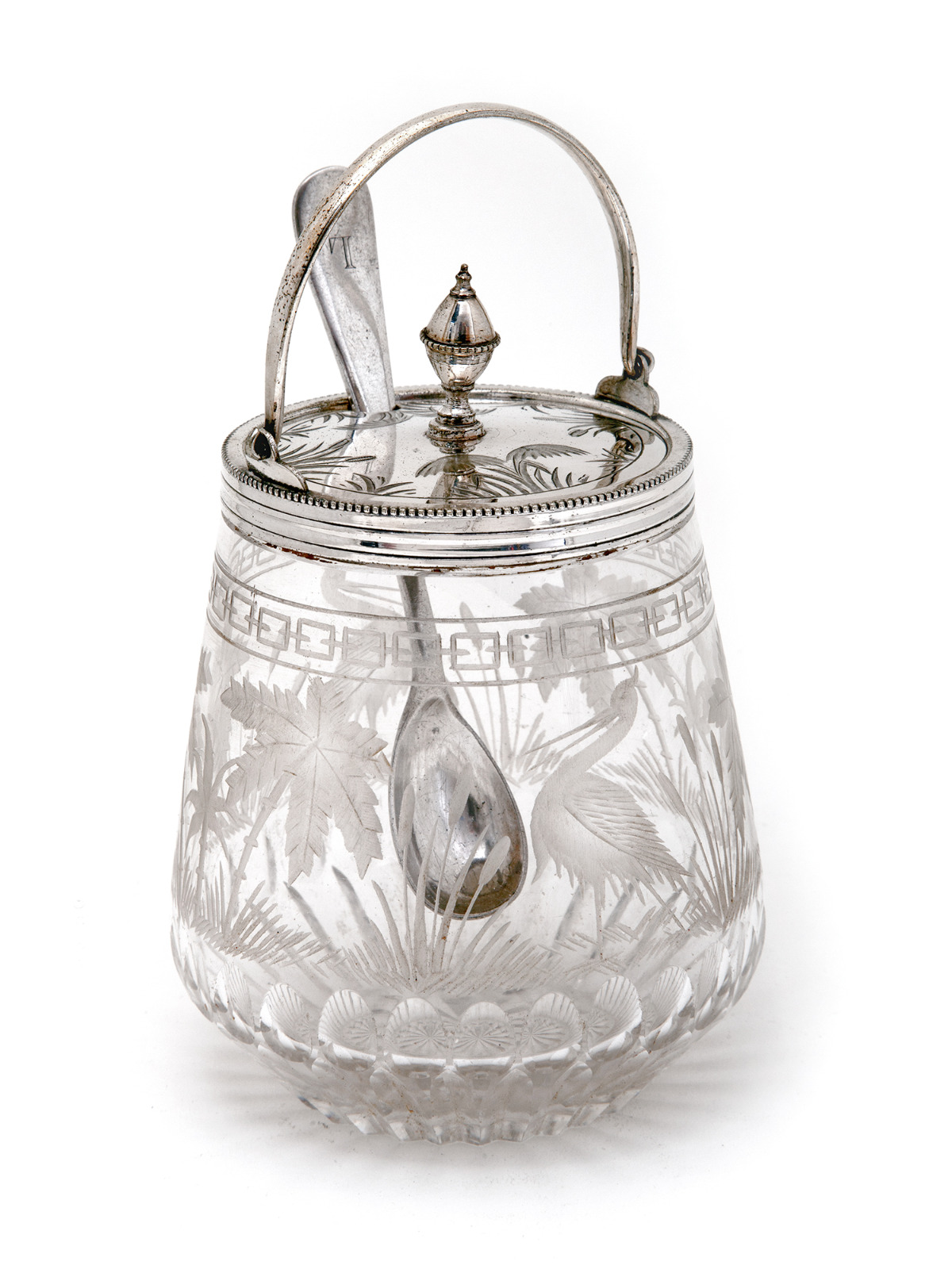 Victorian Silver Plate and Glass Jam Pot Hand Engraved with Herons & Bull Rushes