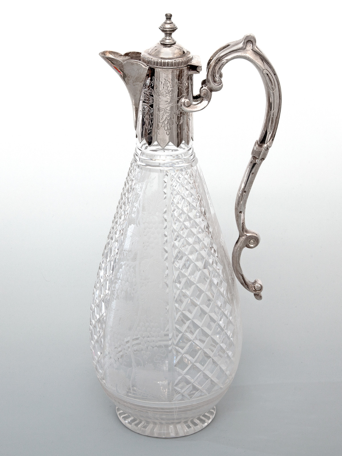 Victorian Silver Plate & Cut Glass Claret Jug Engraved with Grapes & Vines