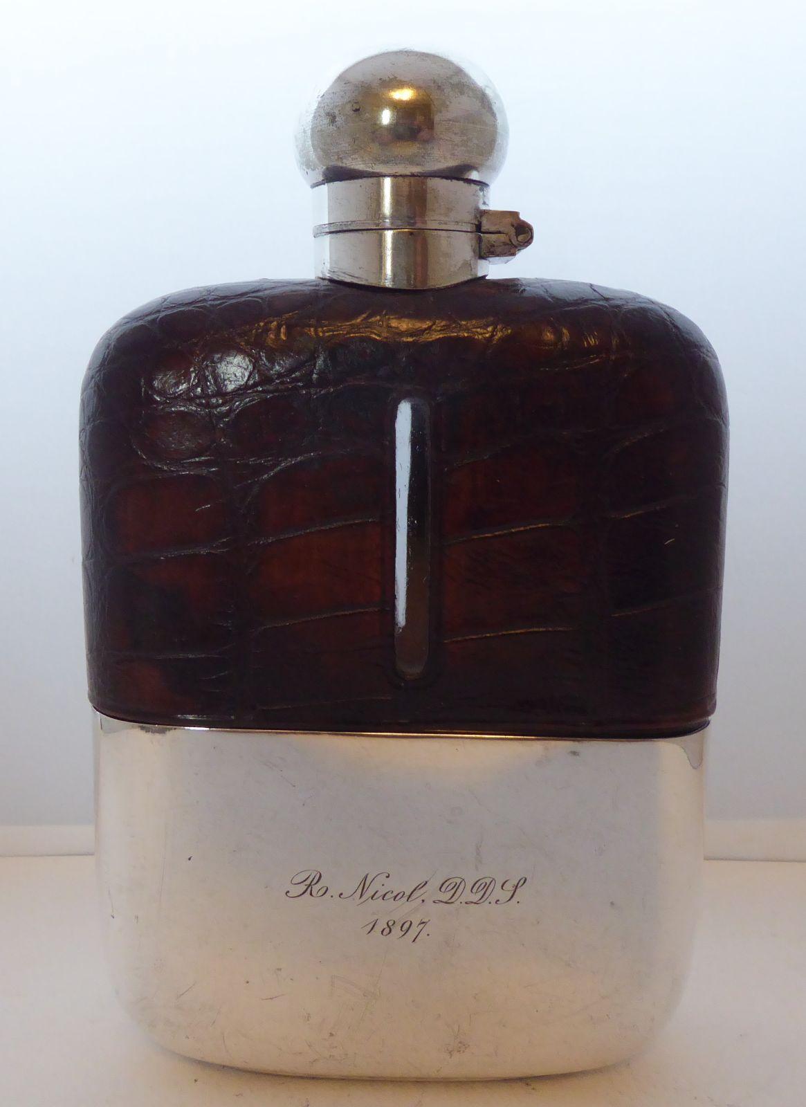 Victorian Silver Plate Plated Crocodile Skin Bound Glass Hip Flask James Dixon