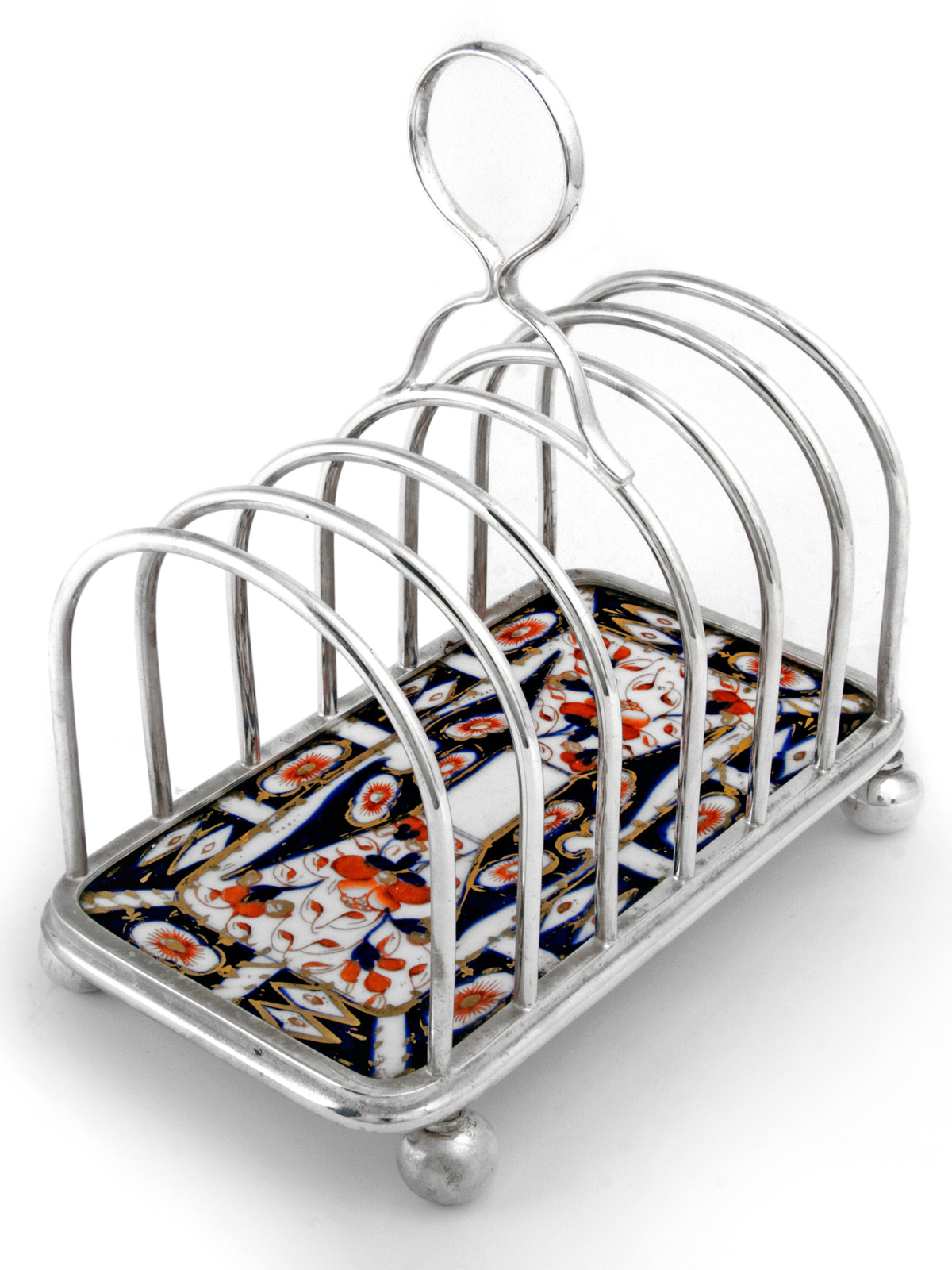 Victorian Silver Plate Toast Rack with an Imari Style Davenport Porcelain Base