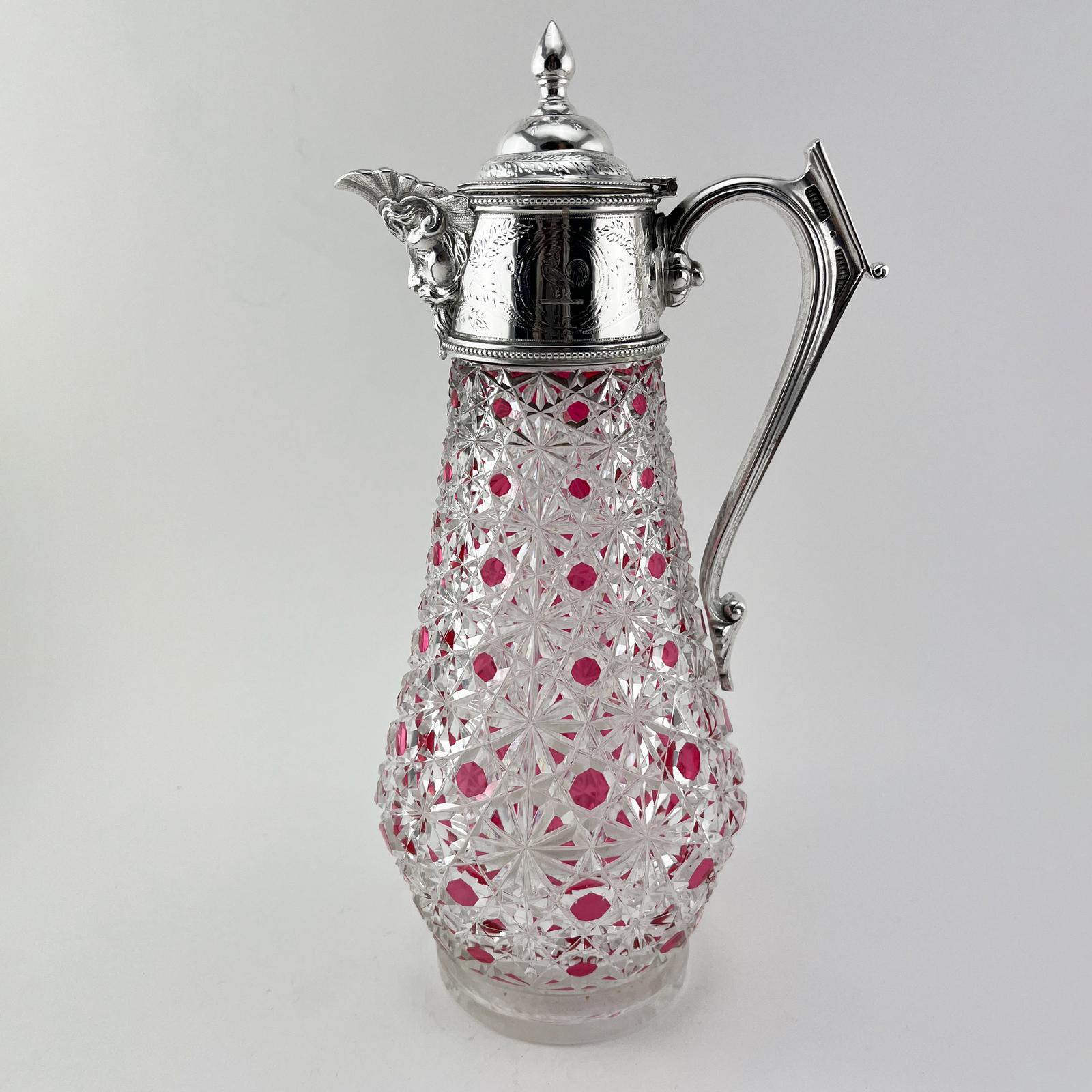 Victorian Silver Plated and Glass Claret Jug with Cranberry Glass Overlay