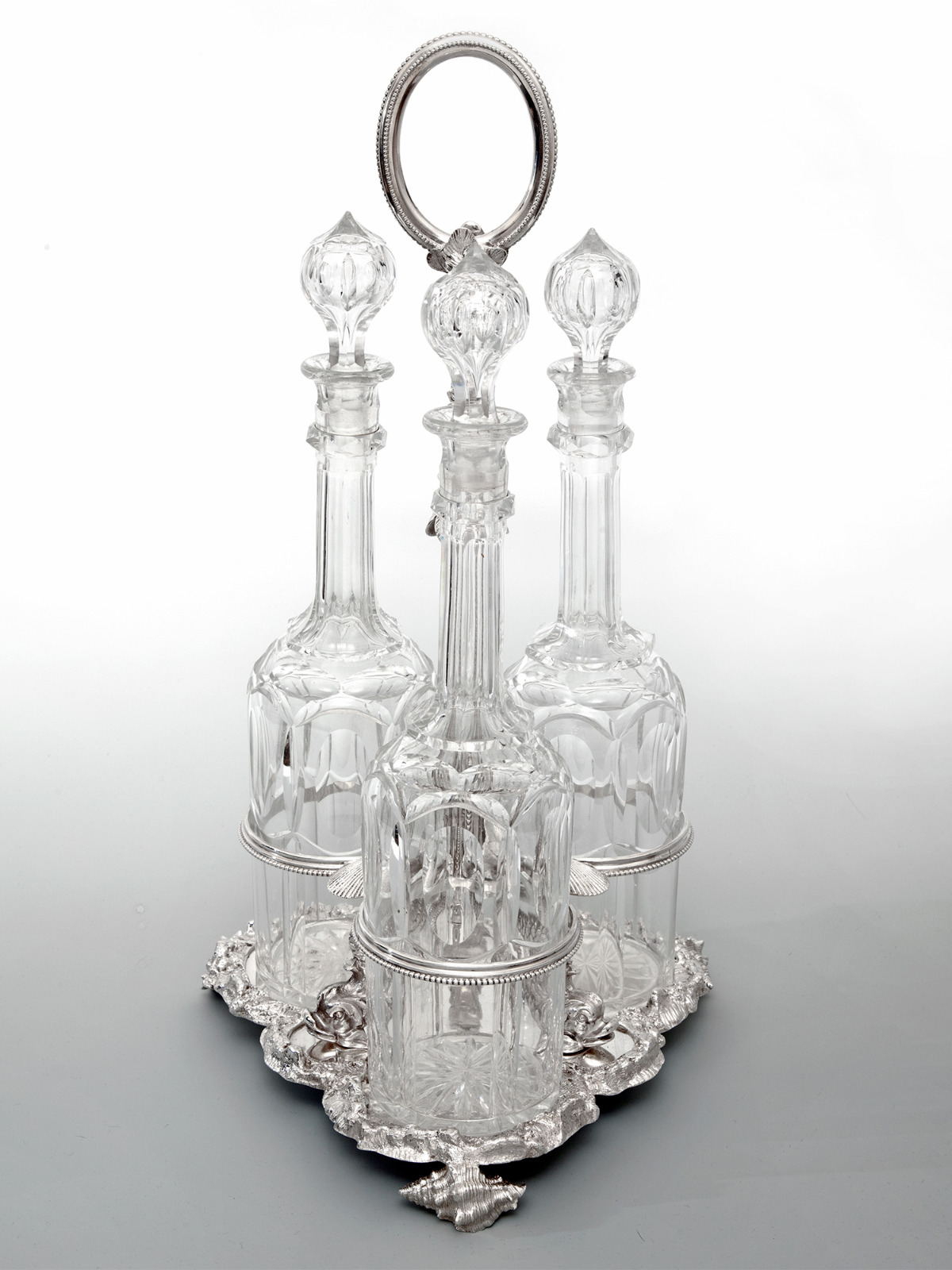 Victorian Silver Plated Cast Decanter Stand with Three Cut Glass Decanters