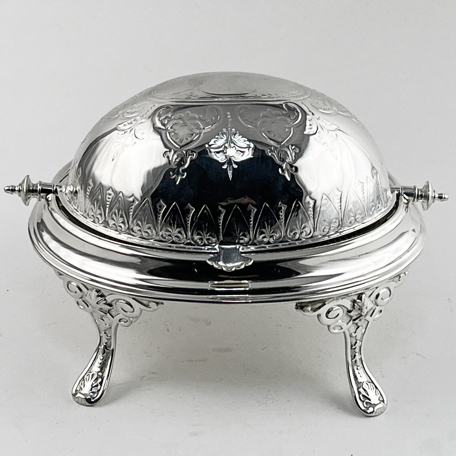 Unusual Victorian (c.1895) silver plated revolving lidded butter or preserve dish. In an oval form with a floral engraved domed lid. The body still retains its original frosted glass liner and stands on four scroll and shell decorated feet and is in very good re silver plated condition.