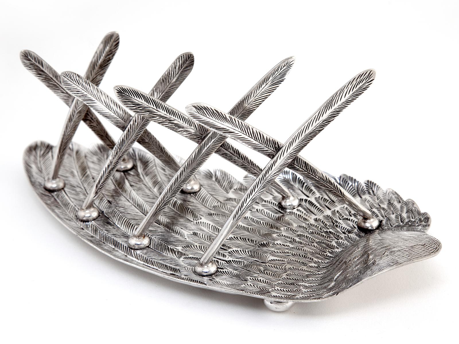 Victorian Silver Plated Toast Rack Shaped as a Bird Wing Engraved with Feathers