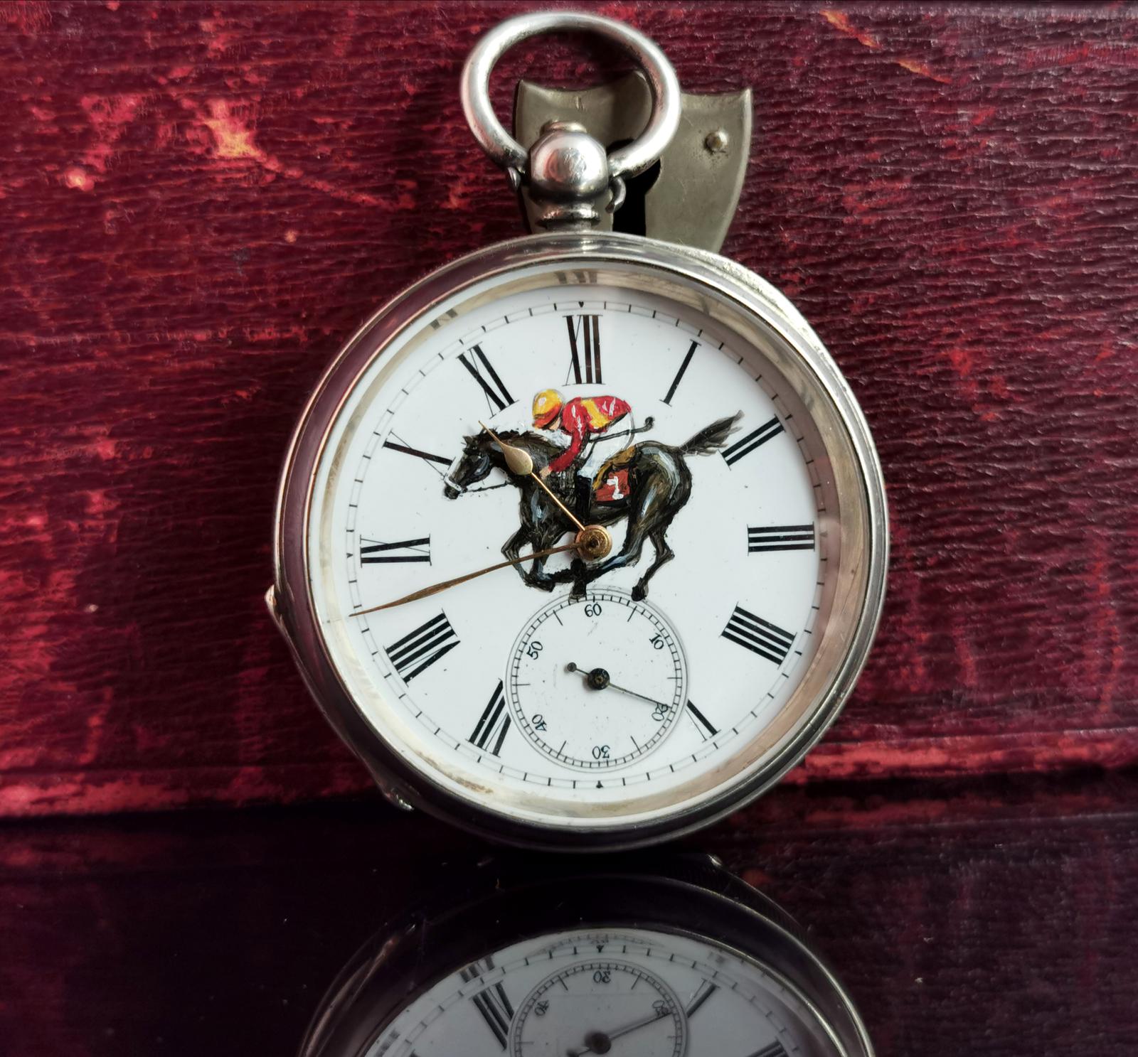 Victorian Silver Pocket Watch, Enamelled, Horse Racing