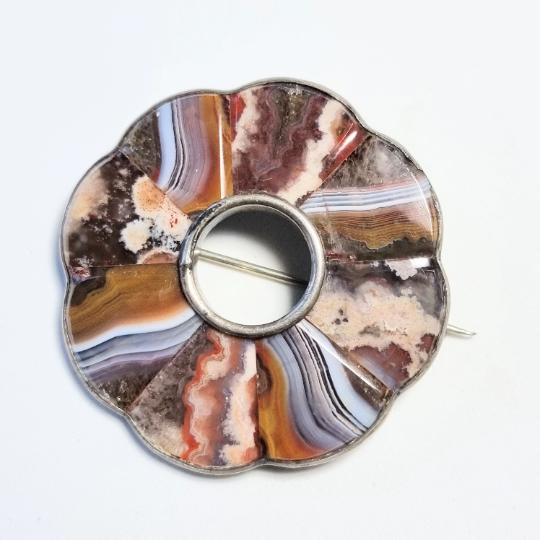 Victorian Silver Scottish Celtic Plaid Brooch, Banded Agate on Slate Backing