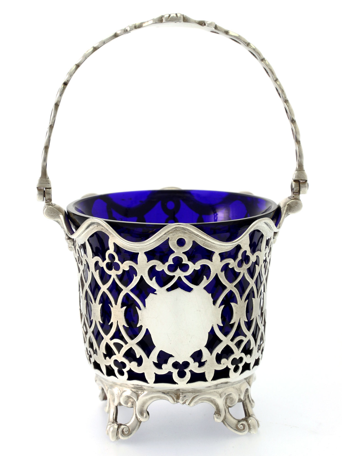 Victorian Silver Sugar Basket with Blue Glass Liner c.1848 (1 of 1)