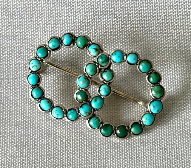 A lovely Victorian silver brooch, formed of two entwined circles. The openwork frame is set with turquoise cabochons and to the reverse the pin is secured by a 'c' clasp. Turquoise is believed to be a protection stone, warding off evil and negativity and the entwined circles represent enduring fidelity. A charming antique piece and a great gift idea.