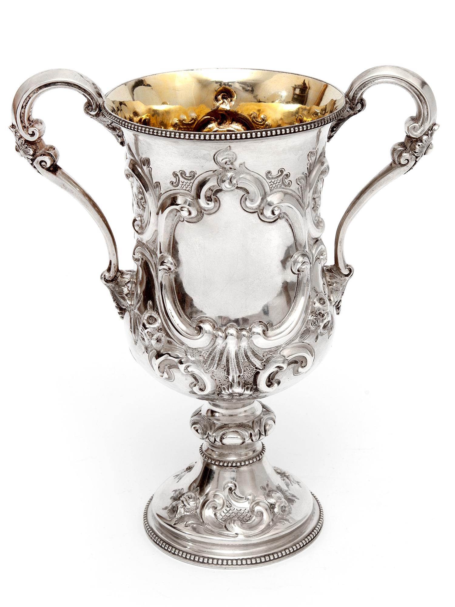 Victorian Silver Two Handle Trophy Cup Chased with Flowers and Scrolls