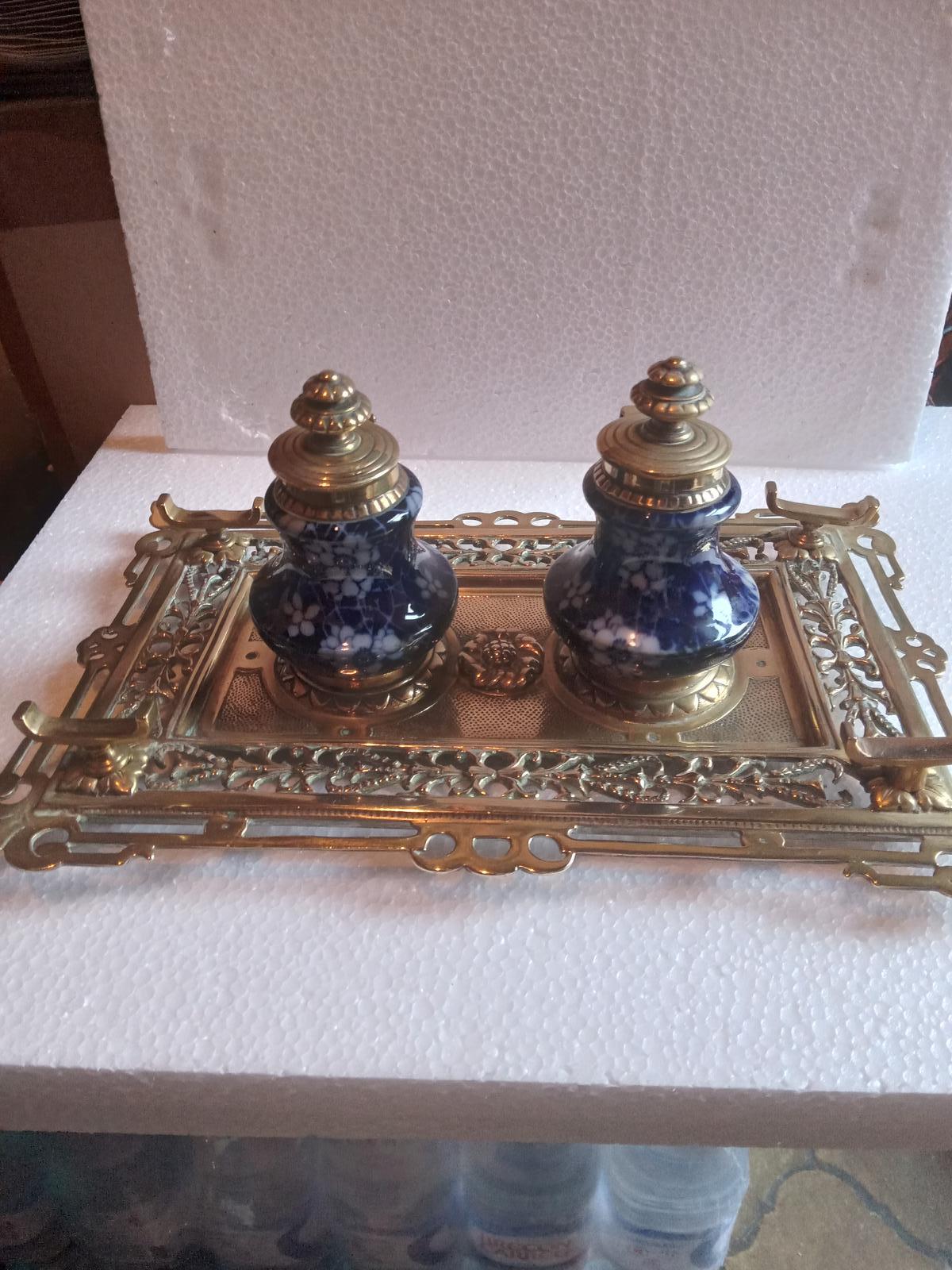 Victorian Solid Brass Inkwell Stand & Pen Holders