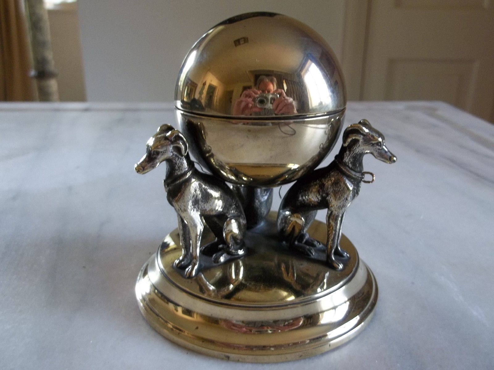 Victorian Solid Brass Inkwell with Three Hound Dogs Supporting a Globe