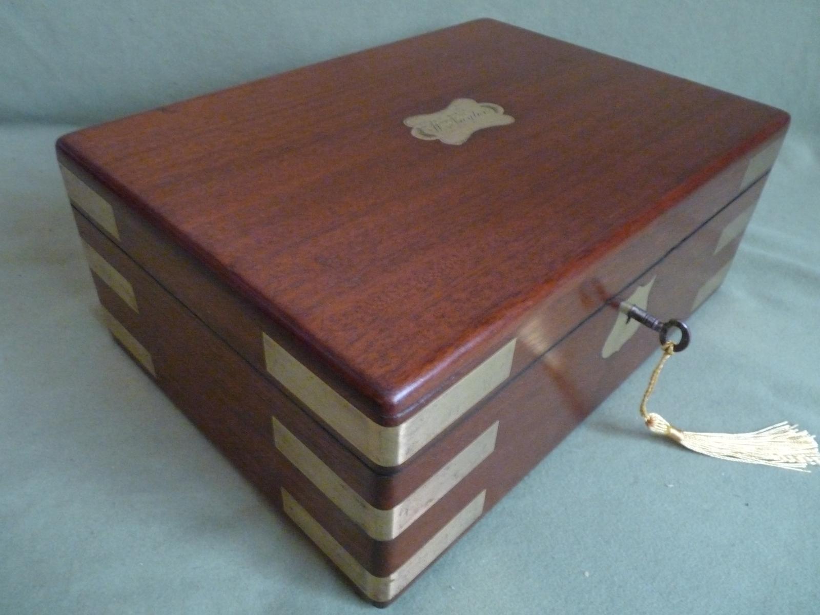 Victorian Solid Mahogany Brass Bound Jewellery Box + Tray c.1860