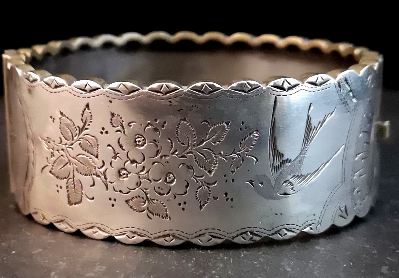 Victorian Sterling Silver Bangle, Engraved Aesthetic Era