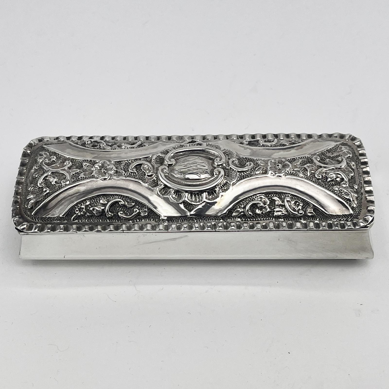 Late 19th Century Victorian antique sterling silver jewellery or trinket box in a rectangular shape with hinged lid embossed with flowers, a central cartouche with initials and a crimped style border, plain shaped body with the original gilt interior.
