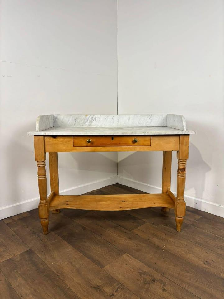 A charming Victorian stripped pine washstand featuring a beautiful white and grey marble top with raised gallery back and sides. This classic piece combines practical design with period character, making it ideal for use as a bathroom stand, hallway piece, or decorative furniture in a bedroom.