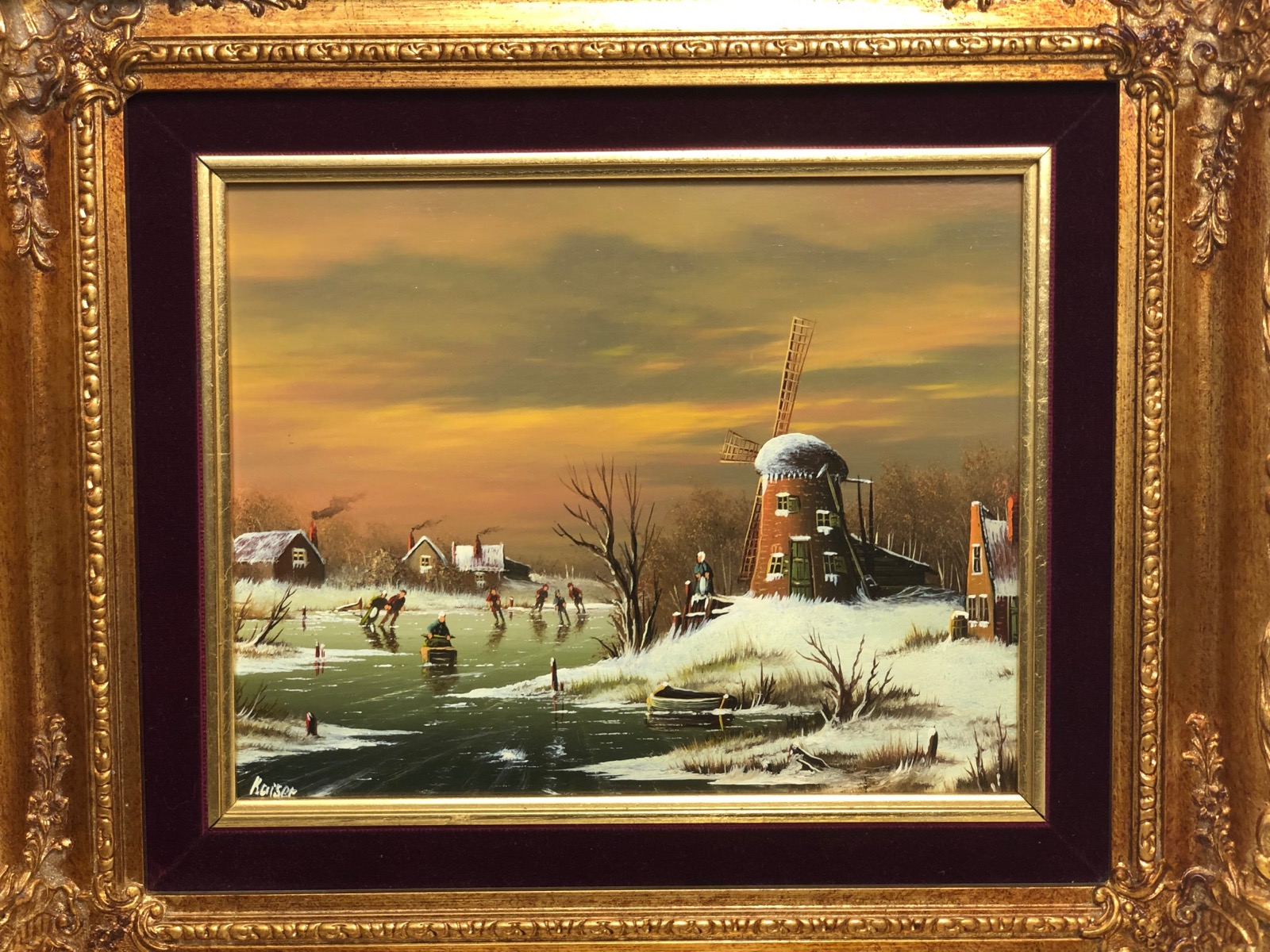 Victorian Style Dutch Skaters Winter Landscape Scene Oil Painting After Anton Doll