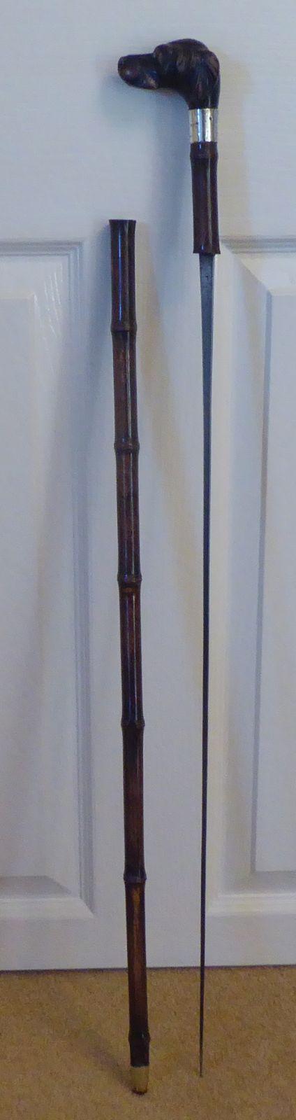 Victorian Sword Walking Stick Cane London 1893 Spaniel Dog Head & Silver French Foil Blade