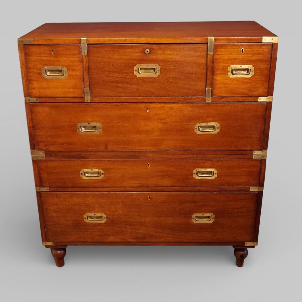 Once an officer was commissioned, he would purchase a campaign chest to take for his service to far flung places around the world. It would have been supplied with specially made cases that each section could slide into ready for shipment. These cases were made of stained pine and have iron corners. Over time these got separated and lost. It is fitted an unusual drawer formation, with 3 drawers along the top, a helmet/hat drawer to each side of the central drawer. Below is a further deep drawer. The lower section is fitted 2 full width drawers. It stands on the original detachable turned feet.