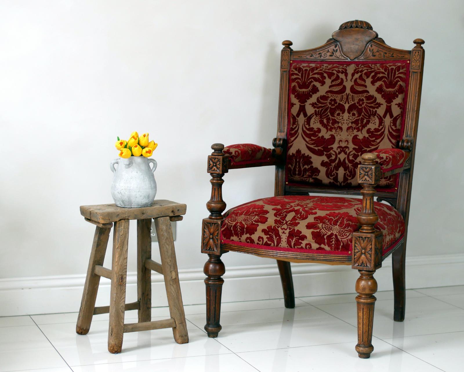 Make a definitive statement in your home with this magnificent Victorian-era Throne chair, crafted from solid, deep-grained oak, this piece isn’t just furniture—it’s a focal point that bridges the gap between historic grandeur and modern eclectic style. The Artistry this chair showcases the peak of 19th Century craftsmanship, featuring intricate hand-carved detailing that defines the Victorian Gothic Revival aesthetic. Exquisite Woodwork: From the stately pediment crown to the robust, fluted legs, every inch of the oak frame exudes strength and character. Architectural Accents: The armrests are supported by beautifully turned pillars and square-carved blocks featuring classic floral motifs. Regal Silhouette: Its high-back design provides a commanding presence, perfect for a primary office chair, a hallway statement piece, or the head of a dining table. The finery wrapped in a luxurious cranberry and gold damask upholstery, the chair offers a rich textural contrast to the dark oak. The traditional acanthus leaf pattern on the fabric complements the wood’s floral carvings, creating a cohesive look of old-world opulence. Specifications at a Glance Feature Details Material Solid English Oak Period - Late Victorian (c. 1880-1900)Upholstery Period-style Red & Gold Damask Condition Excellent vintage condition with a rich, natural patina Style -Gothic Revival / Neo-Renaissance
