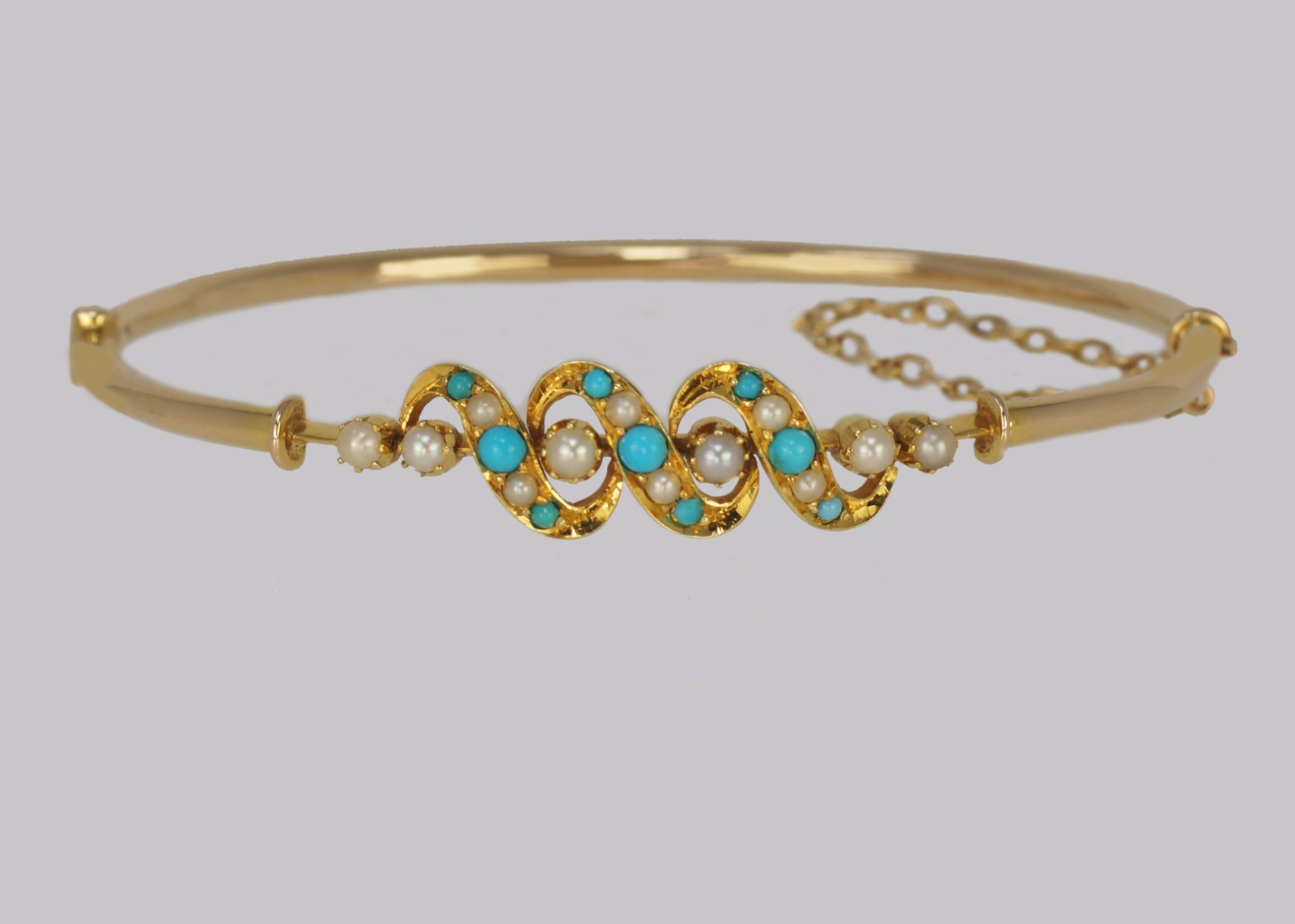 Victorian Turquoise & Pearl Bangle Antique 15ct Gold Bracelet with Box circa 1900