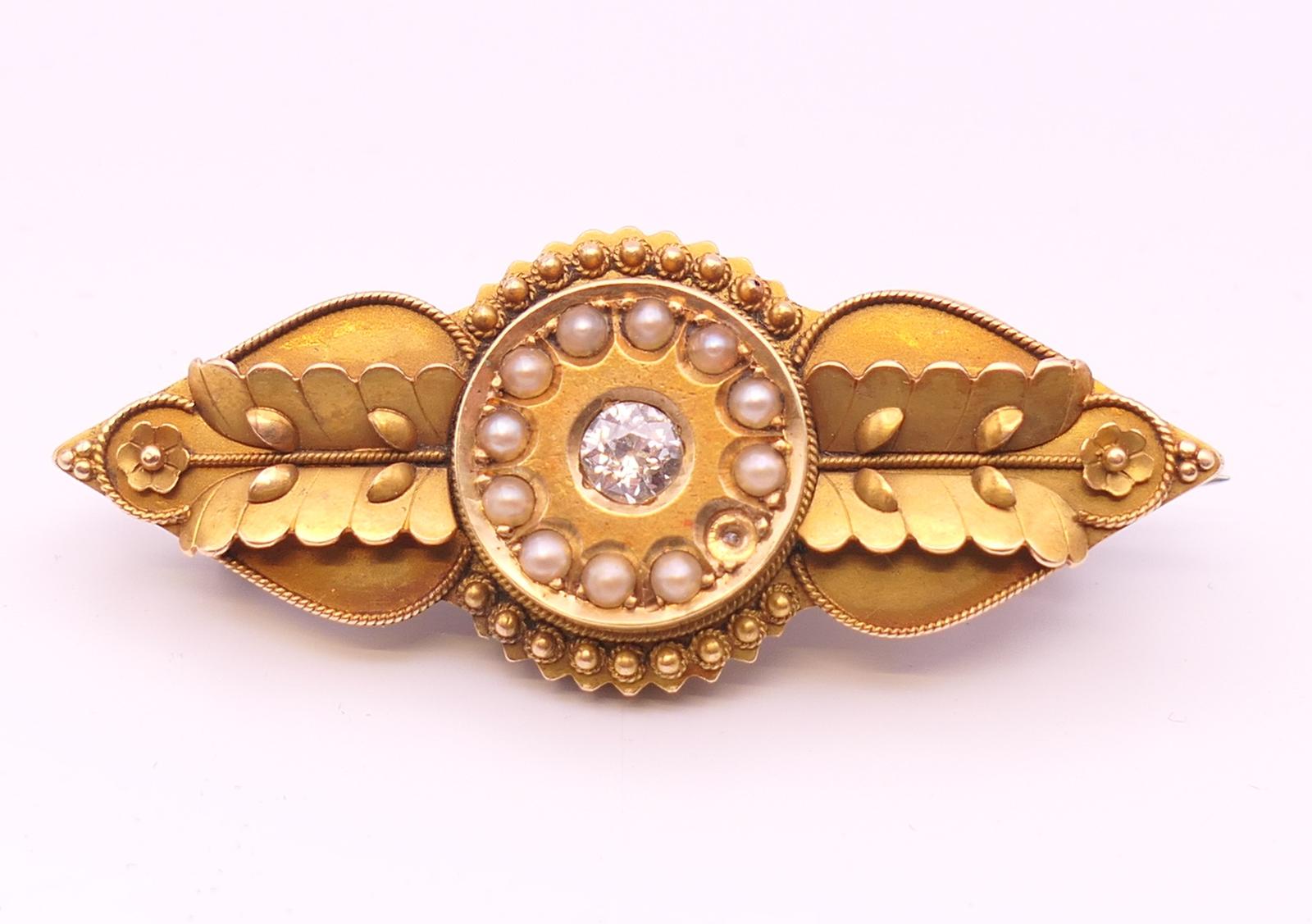Victorian Unmarked Gold Diamond & Seed Pearl Brooch
