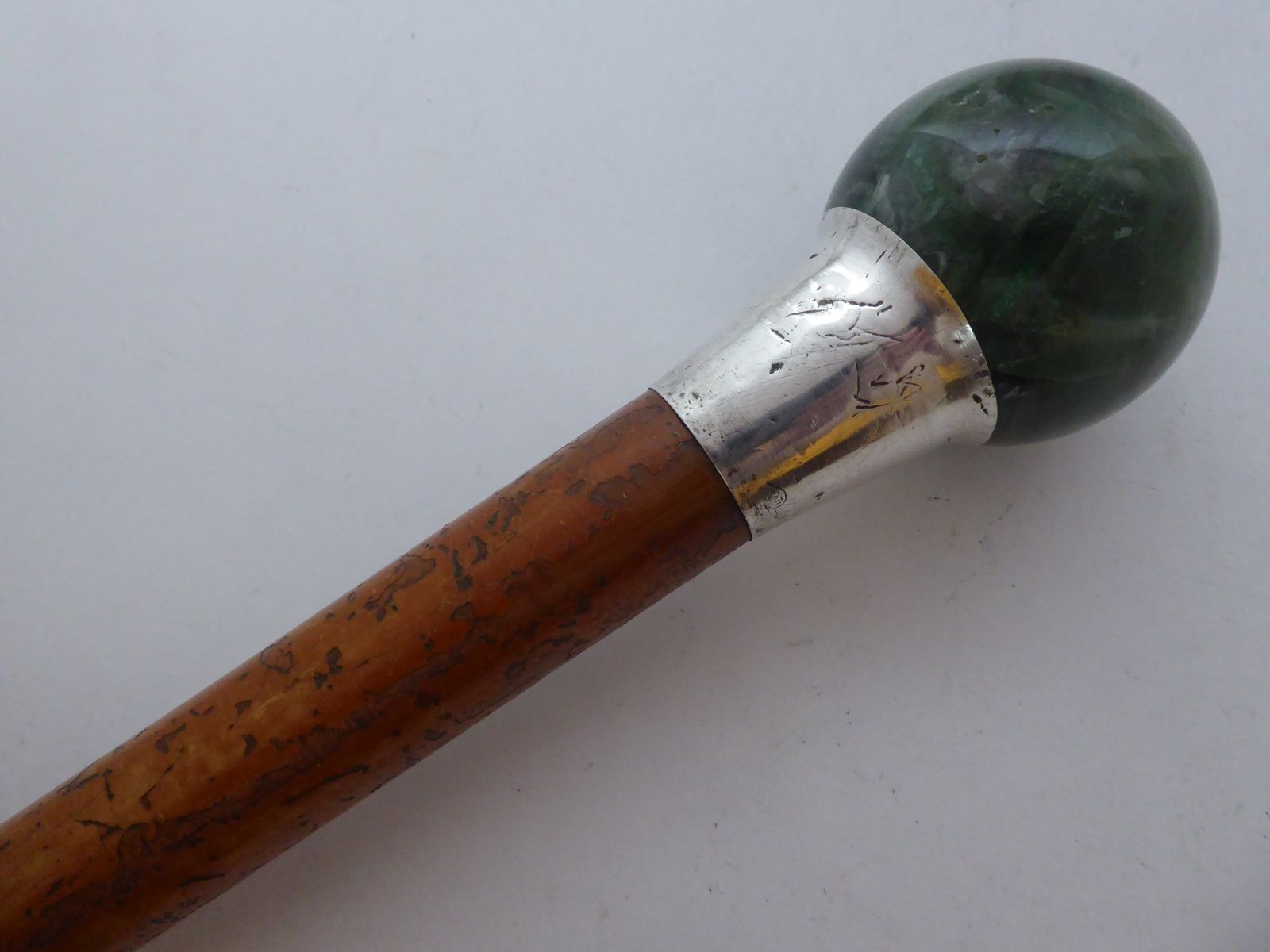 Victorian Walking Stick Cane 1890 Solid Silver Jade Agate Pommel Malacca Shaft