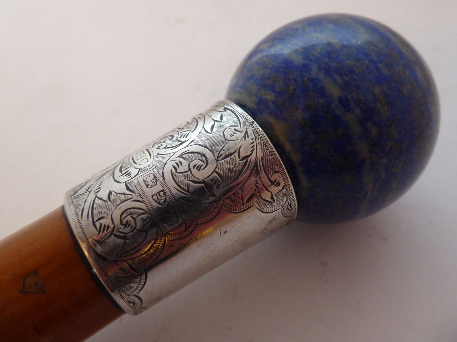 Victorian Walking Stick Cane 1896 Hallmarked Solid Silver Collar Lapis Pommel Malacca