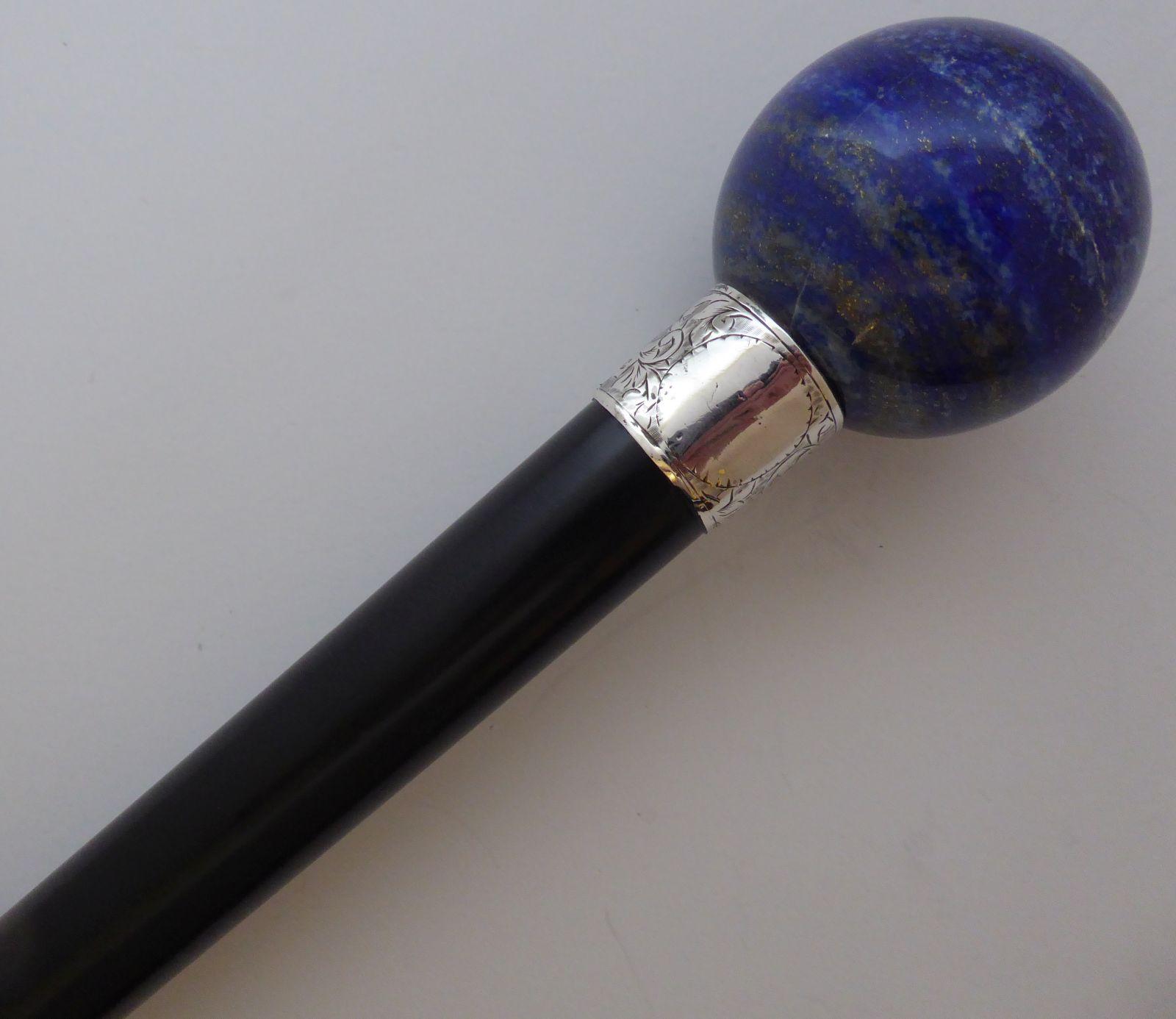 Victorian Walking Stick Cane 1897 Hallmarked Silver Collar Ebony Shaft Lapis Lazuli Top